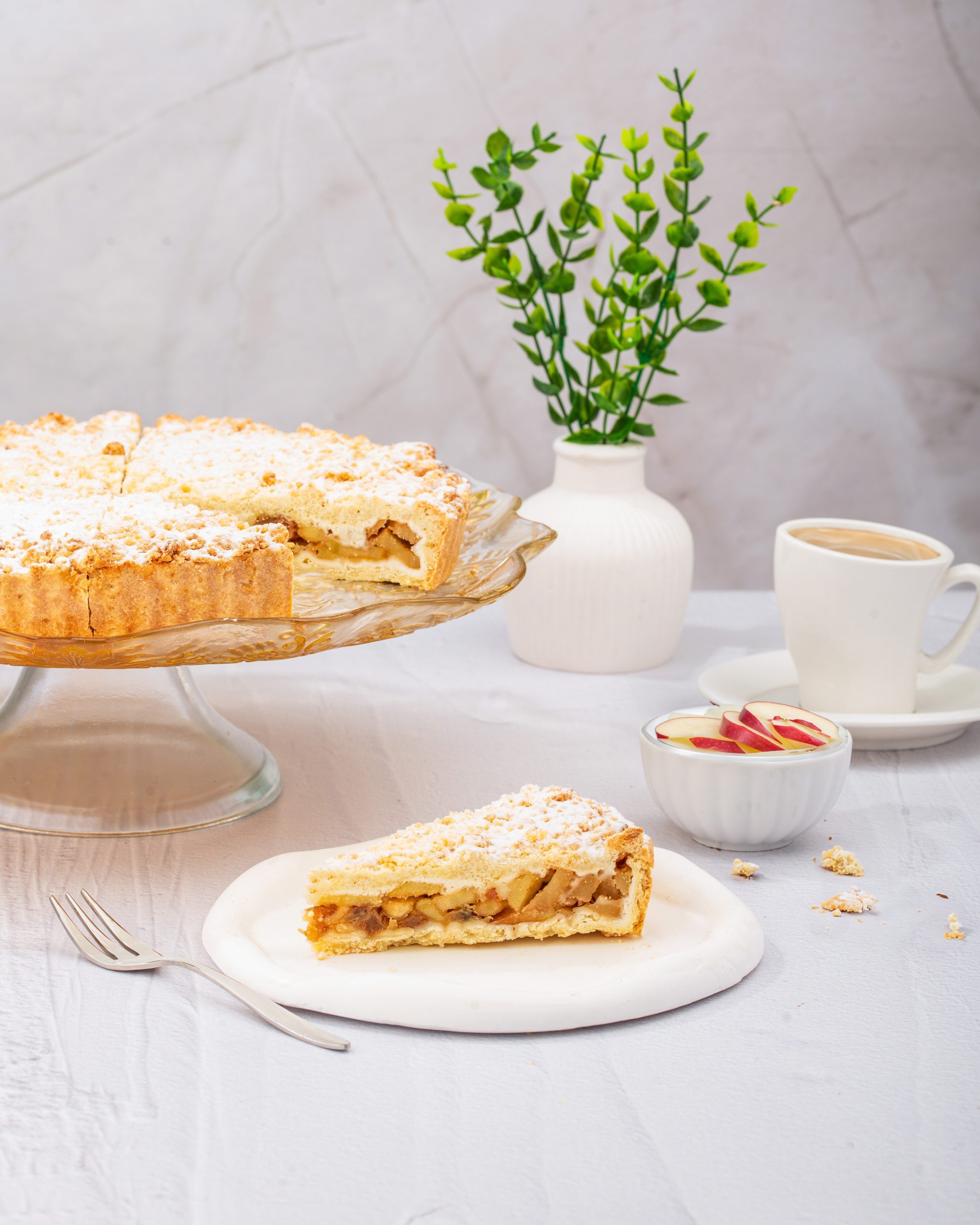 Pie flovered with apple, raisins and cinnamon … | Özellikler: | – Shelf life: +4° 72 Hours; -18° 1 Year | – Portion weight: 130 gr | – Slices per cake: 10 | – Boxes: 14
