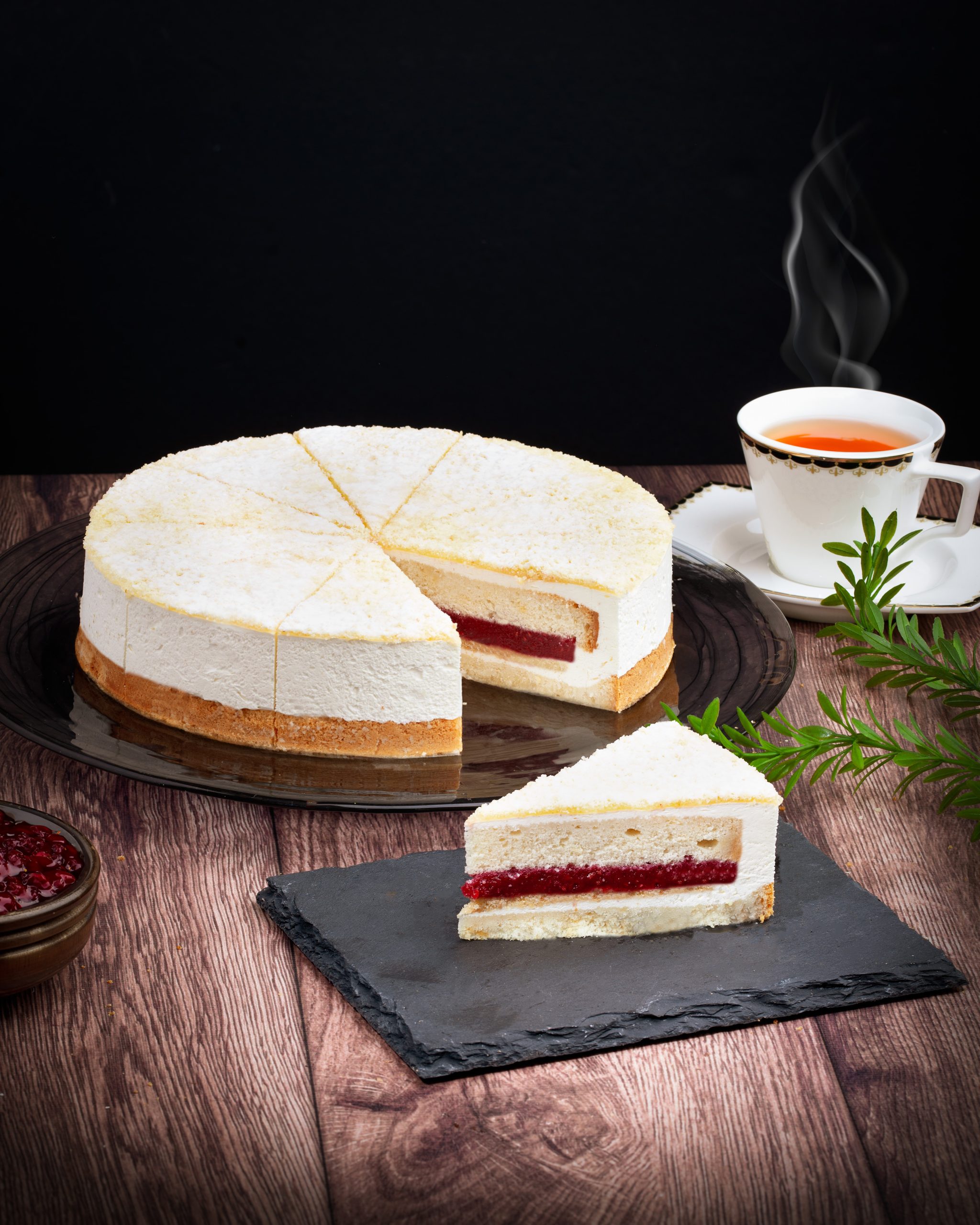 Cherry and raspberry marmelade between special pastry cream… | Özellikler: | – Shelf life: +4° 72 Hours; -18° 1 Year | – Portion weight: 100 gr | – Slices per cake: 12 | – Boxes: 10
