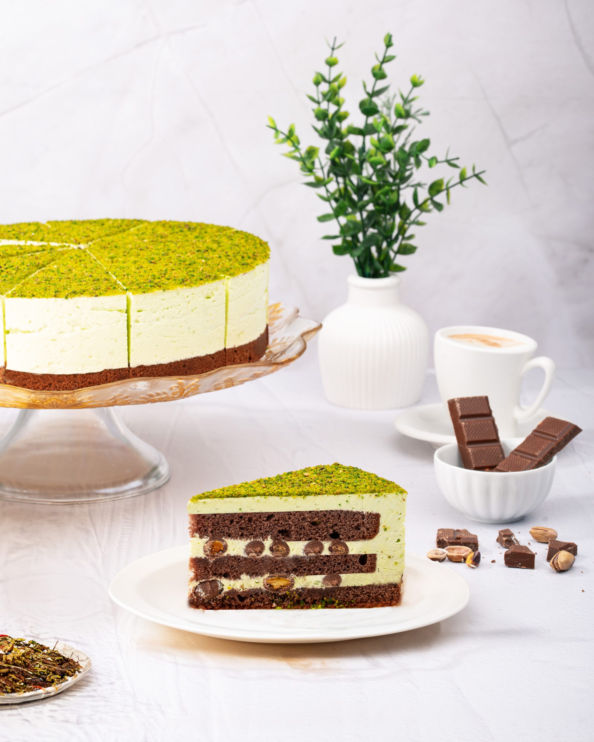 White and dark pastry cream on cake layers; over it real pistachio … | Özellikler: | – Shelf life: +4° 72 Hours; -18° 1 Year | – Portion weight: 110 gr | – Slices per cake: 12 | – Boxes: 10